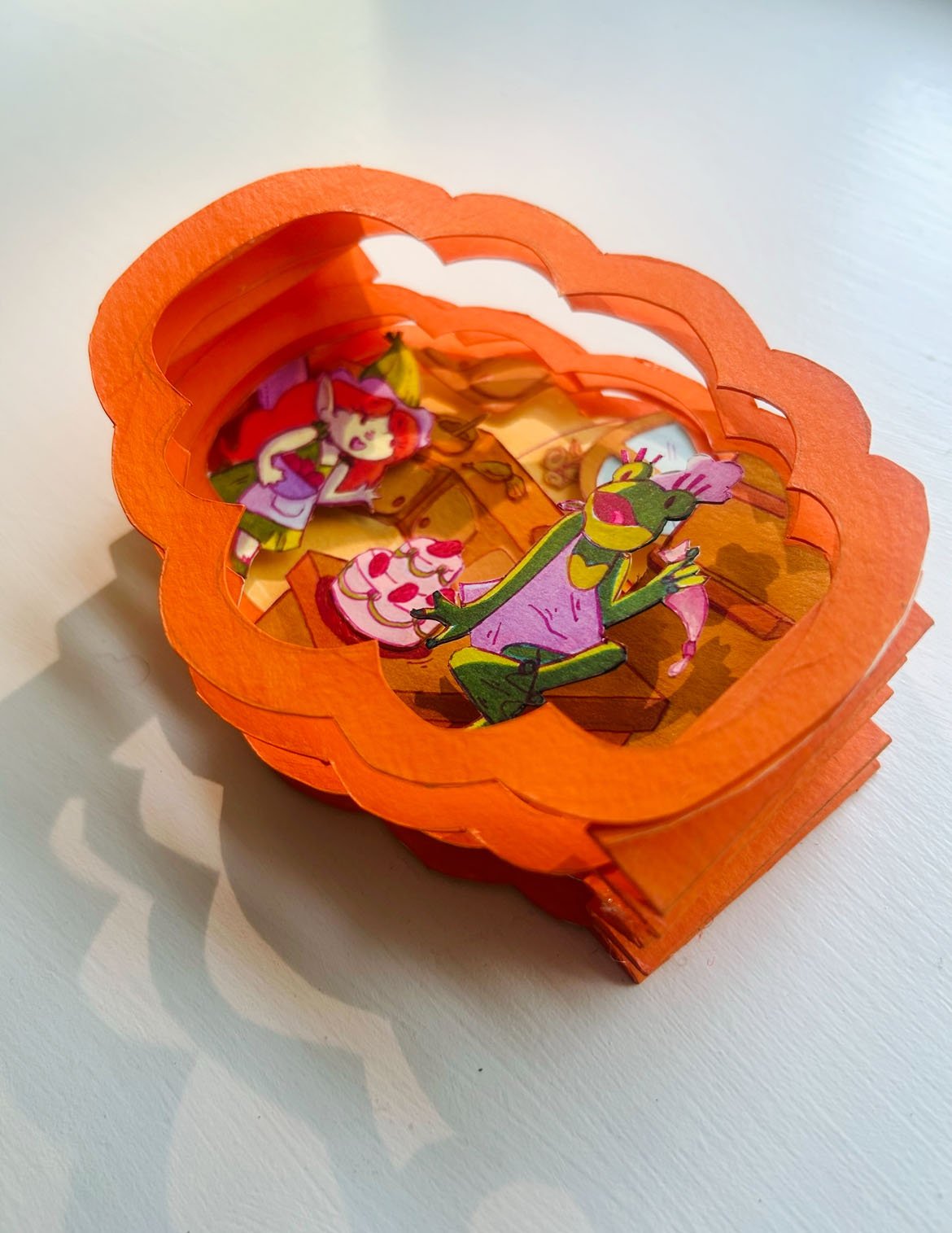As a storyteller, I think not only about animations, comics, and illustrations, but I also love exploring the physical experience of holding and looking into a book. “Tulip and Francine” is a current concept I have about two best friends, a fairy (Tulip) and a frog (Francine), who live together in a pumpkin.